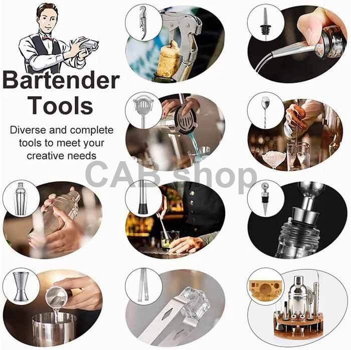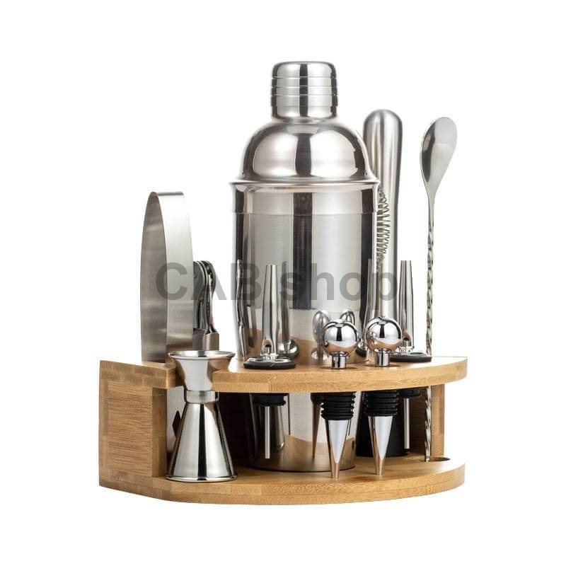 Kompletní set pro každého barmana: Barmanský set obsahuje 12 esenciálních nástrojů včetně šejkru Cobbleru (750 ml), kleští na led, filtru "sítka", drtiče "muddler", dlouhé barové lžíce, vývrtky, otvíráku na láhve, tří nalévaček, oboustranné odměrky ( 15 ml / 30 ml - "jigger") a nerezového stojanu. Tento komplexní set je ideální pro začátečníky i profesionály.