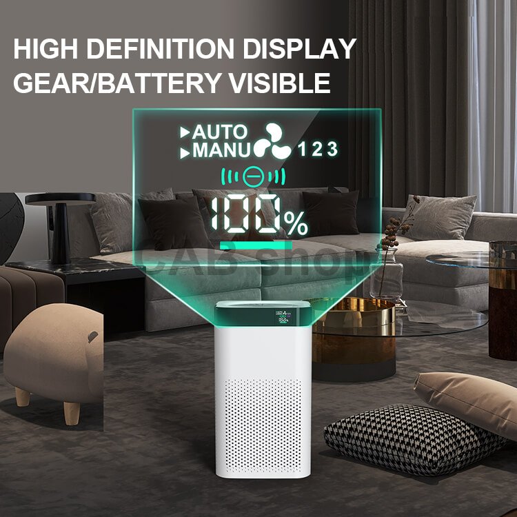 VÝKONNÁ FUNKCE Tato čistička vzduchu rychle cirkuluje vzduch v místnosti o rozloze až 20 m² a odstraňuje širokou škálu nečistot, včetně pylu, prachu a znečišťujících látek, srsti domácích zvířat, spór plísní, zápachu z vaření a kouře ve vaší ložnici, pracovně, obývacím pokoji nebo . Koncentrace záporných iontů: 8*10⁶PCS/cm³( Test ve vzdálenosti 100 mm od hlavy vysílače) Doba nabíjení: přibližně 7 hodin